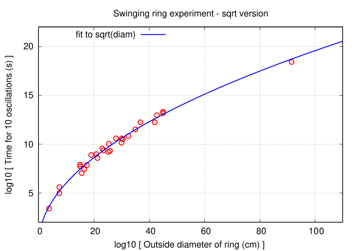 Before our class met, I measured the oscillations of a much larger ring: a hula hoop. If we add those measurements to the dataset, one can see more clearly that a simple linear fit to (time vs. diameter) doesn't work well.