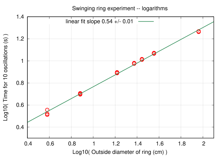 On the other hand, if we compute the LOGARITHM of each quantity, and plot log(time for 10 oscillations) vs. log(diameter), then we see a pretty nice linear relationship: