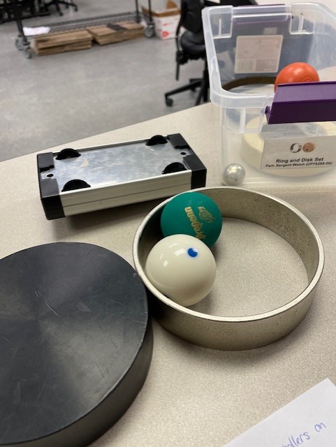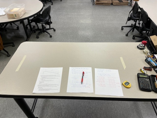 To set up for the "rolling race" experiment, use the instructor's table. I've placed to tape marks a distance 100 cm apart; if they have been removed, make your own.