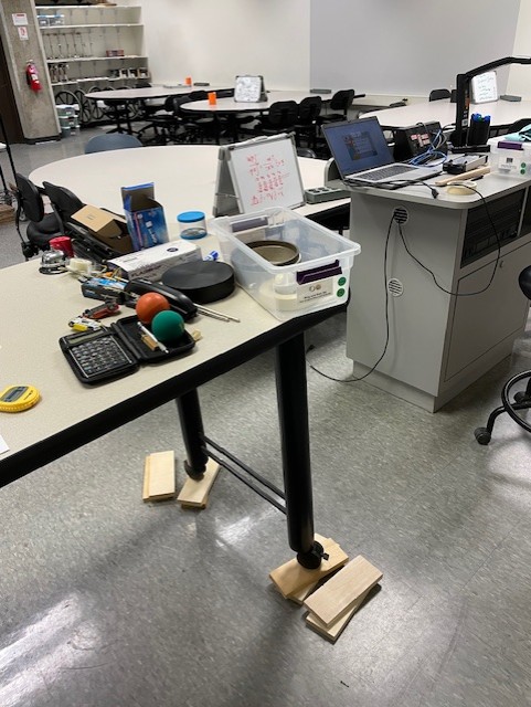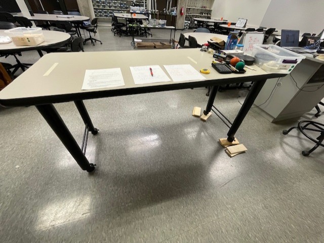 Unlatch the rollers of the instructor's table, and roll it a small distance away from the podium, so the students can see it more clearly and so it the right side can be raised up. Re-latch the rollers to lock them in place. Place two wooden blocks under each of the right-hand rollers.