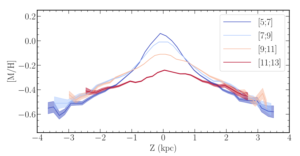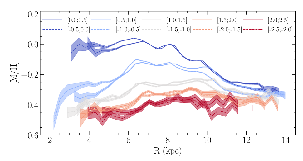 There's also a RADIAL gradient in the metallicity of stars, as one moves from the center of the Milky Way outwards: in general, the metallicity is highest near the center and lowest in the outer regions. However, that depends on exactly which stars one measures. Stars shown in blue below are those closest to the middle of the plane of the disk, while stars shown in red lie at some distance from the plane.