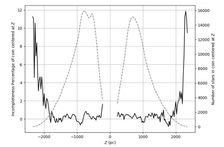 Based on the observational limitations of Gaia, the selection should be "complete" out to a vertical distance of about 2000 pc above or below the plane. That is, any stars within this region SHOULD be included in the sample. At large distances, the dataset becomes "incomplete" -- meaning that it will be missing some fraction of the stars.