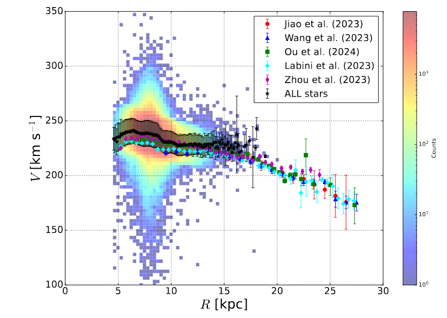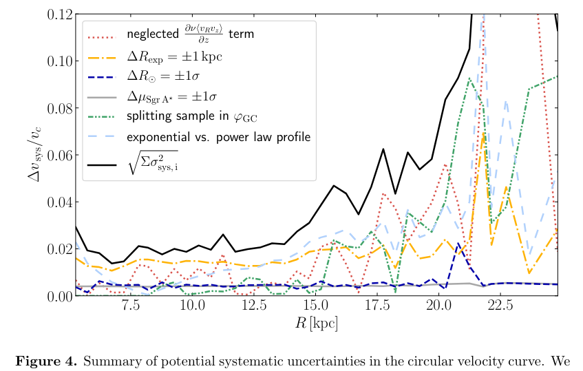 But we can't become too confident: there are several different types of error that can creep into our calculations. A paper by Eilers et al. (2019) describes in detail how various factors can affect the results (see Section 5.2 in particular). Many of the calculations depend upon the density distribution of the stars being used as tracers -- we need to correct the observations for incompleteness and bias to interpret them properly. Although the uncertainty in the rotation speed is just a few percent in the solar neighborhood, it increases rapidly as one looks farther and farther away.