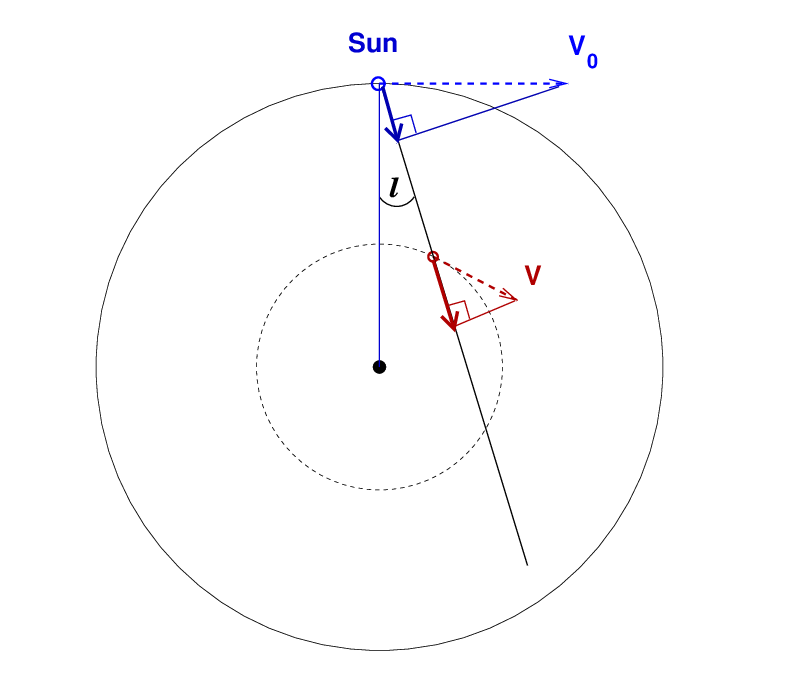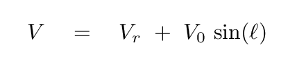 Now, suppose we point our radio telescope at the cloud, which is located at galactic longitude ℓ. When we tune out telescope to the 21-cm emission line of neutral hydrogen, we won't measure the orbital speed V directly. Instead, the wavelength of the emission from this cloud will be shifted by the radial velocity Vr, which is simply the difference of the radial components of V and V0 along the line of sight.