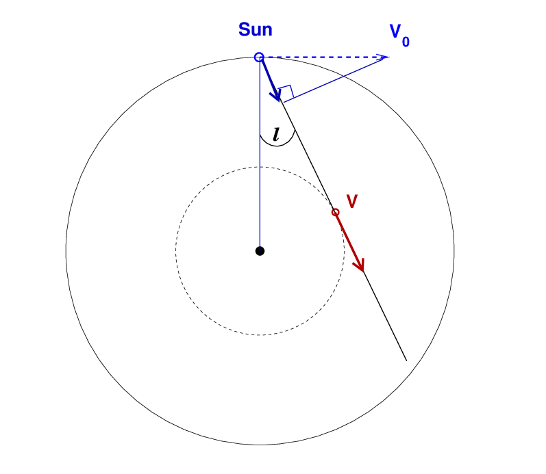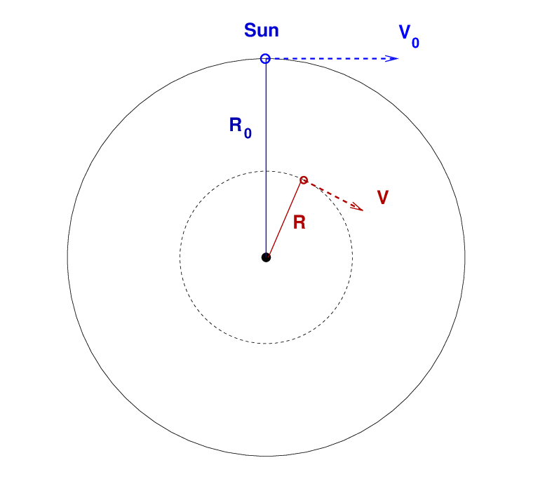 Let's consider measuring the radial velocity of clouds of gas which are located closer to the center of the Milky Way that the Sun. The diagram below shows a bird's-eye view of the Galaxy, looking down from above the galactic North Pole. The Sun orbits at a distance R0 at a speed V0, while one particular cloud of gas orbits at a distance R with a speed V.