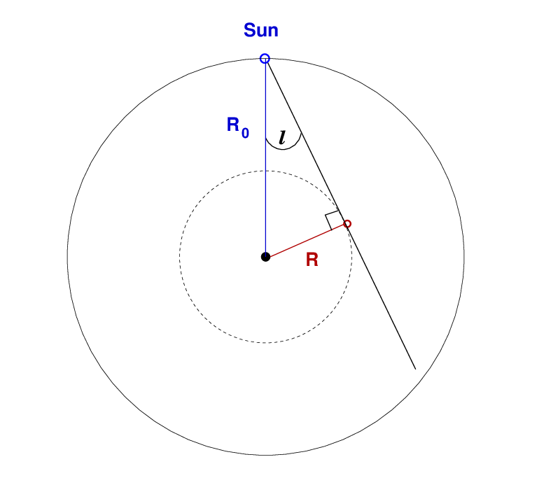 Figuring out the sizes of these radial components of each velocity is rather involved; see your textbook or, for example, Peter Kalberla's guide to the analysis of 21-cm line profiles. Today in class, we'll consider just one particularly simple case: a cloud which is moving directly away from the Sun along the line of sight. As the diagram below shows, the orbit of this cloud must be tangent to the line of sight of our radio telescope.