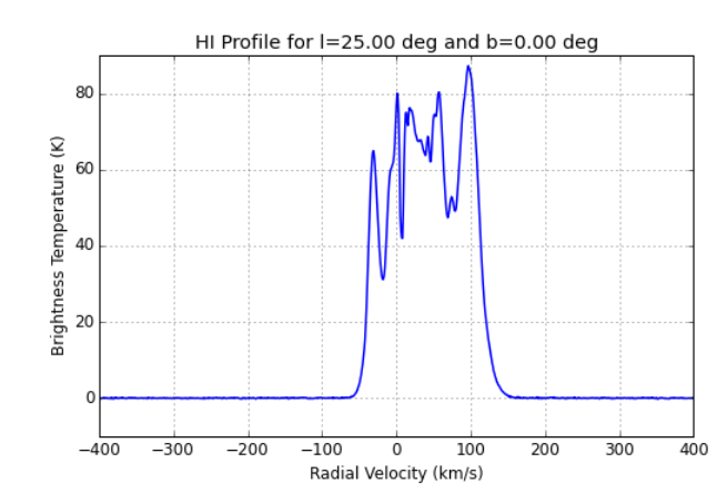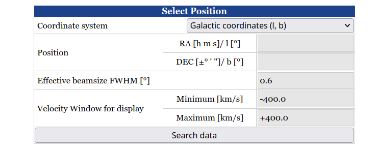 Enter a galactic longitude and latitude into this box, then click on "Search data". After a brief wait, you will be shown actual measurements of the radio emission in that direction from the Leiden/Argentine/Bonn (LAB) Survey of Galactic HI, based on observations made with a pair of big (diameters of 25 and 30 meters) radio telescopes in the years between 1989 and 2000.