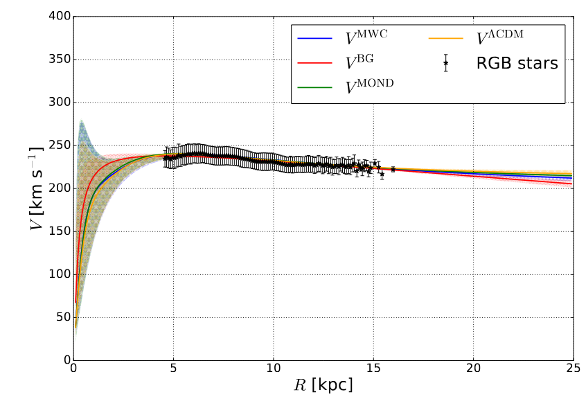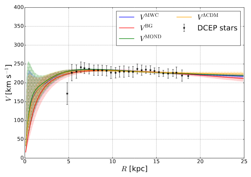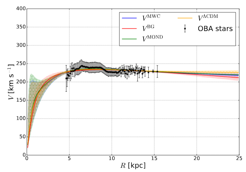 No matter which tracer we choose, the shape of the extended rotation curve of the Milky Way seems clear: nearly flat, but with a slight decrease in speed at larger galactocentric distances. The fact that all three tracers agree with each other is a good sign that our conclusions are firm.