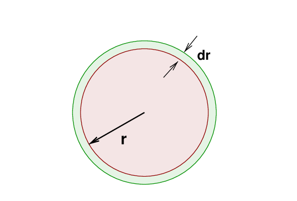 Okay, now we put it all together: suppose we build a sphere of uniform density ρ, starting with a teeny tiny sphere at the center and subsequently adding layers of thickness dr, until the final radius of the object is R.