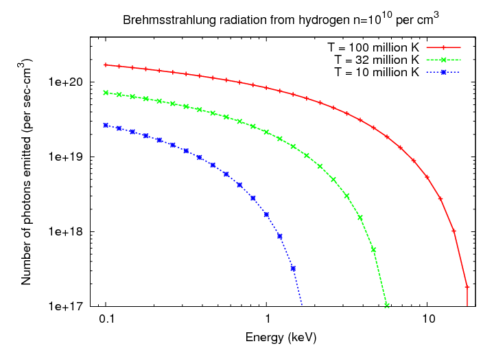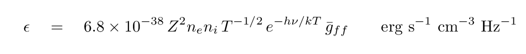 Now, in the 1890s, the source of the energetic electrons was radioactive decay. But out in space, the source of the energetic electrons is often a hot, ionized gas. In that case, the distribution of electron energies is dictated by the temperature of the gas, and so we call the process thermal brehmsstrahlung. In this common case, the emissivity of the gas -- a measure of how much energy it emits per second per unit volume per unit frequency -- can be written as