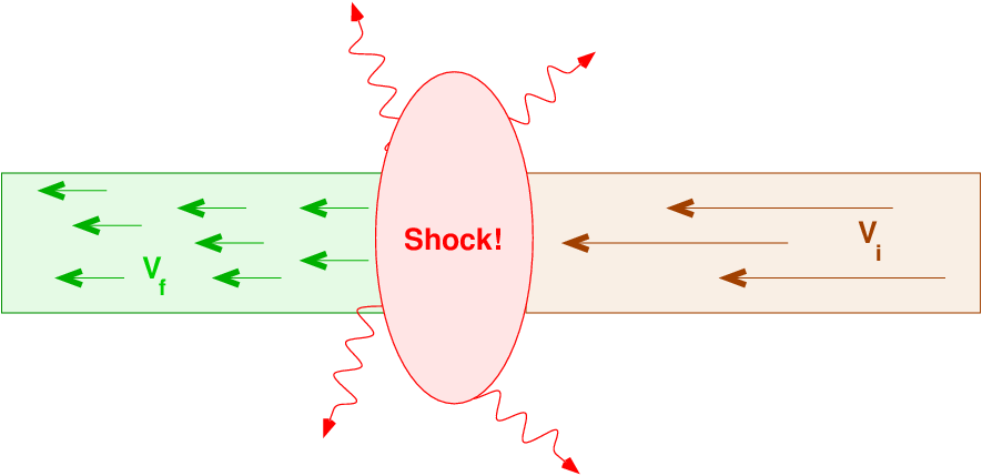 In general, the material running into a shock with some initial speed vi and low initial density comes out of the shock with a much lower final speed vf, but a higher final density and final temperature.