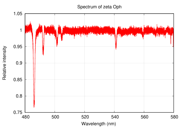 Before we can start examining this very hot gas, we need to understand the units which will be used to describe our measurements. Very hot gas emits, for the most part, X-rays. In the optical range, scientists typically mention the wavelength of light, or its frequency. The spectrum of a star in the optical will often have "wavelength measured in nm" on the horizontal axis, like this: