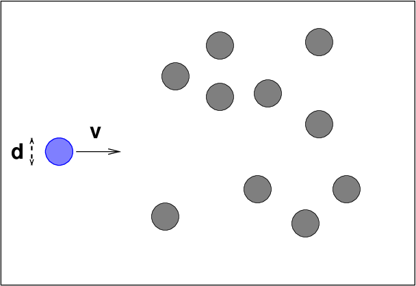 If we have a gas of atoms with typical diameter d and radius r = d/2, with density n atoms per unit volume, the question is -- how far will the blue particle typically travel before it strikes an atom? We can simplify the calculations by imagining an equivalent situation, in which the blue particle becomes twice as big and all the other particles shrink down to perfect little points: