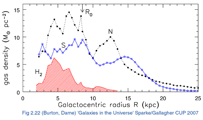 The surface density values shown below are based on measurements made by radio telescopes at several observatories. The dotted black and solid blue lines show the surface densities of HI gas determined by telescopes looking at the northern and southern galactic hemispheres, respectively.