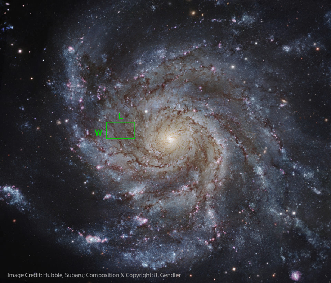 So, for example, if we wished to calculate the mass of all the interstellar gas within the rectangular box in the figure below, we would first compute the area of the box: (L x W) square parsecs. Next, we'd multiply by the surface density of gas, (solar masses per square parsec), to end up with the mass of the gas within the region.