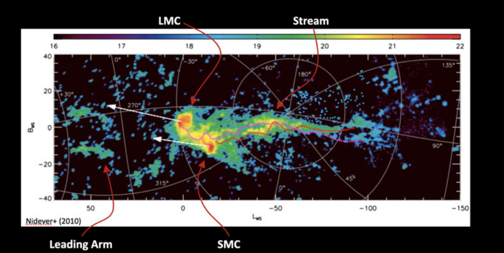 First, Gaia and other surveys have measured the proper motion of stars in the Magellanic Clouds directly. The average direction of those measurements is shown in the figure above by the white arrows. As one can see, it points in the direction oppposite to the Stream.