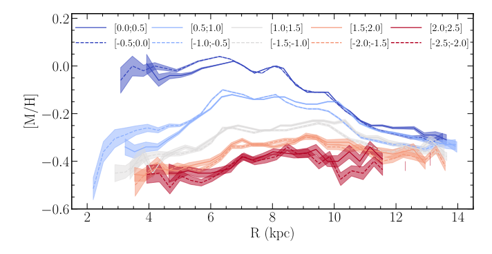 The most metal-poor stars in the galaxy appear far above and below the plane of the disk, as the figure below reveals: the different colors represent measurements of stars at different distances away from the plane in kpc. Note that even the metal-poor stars in the halo still have typical metallicities of about -0.5.