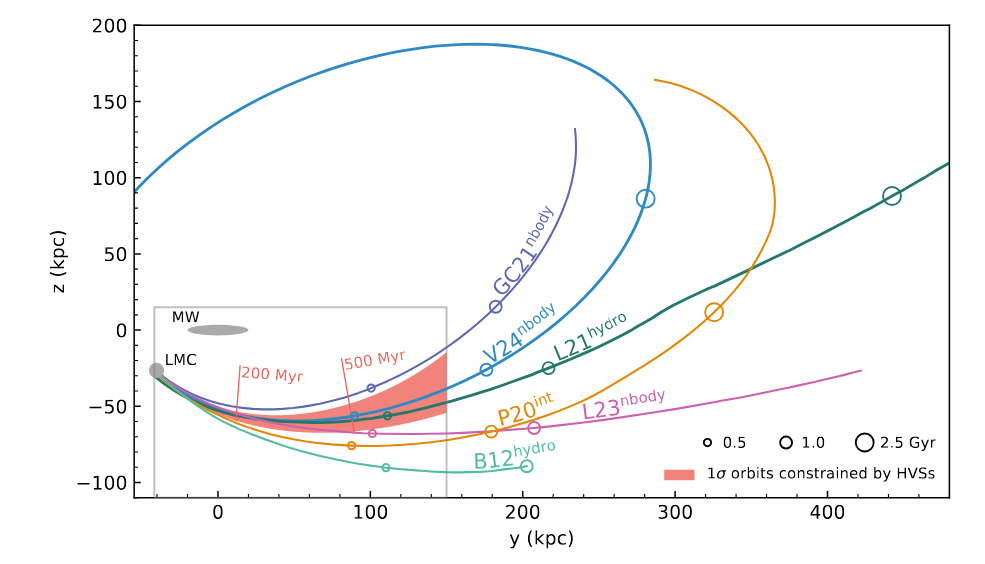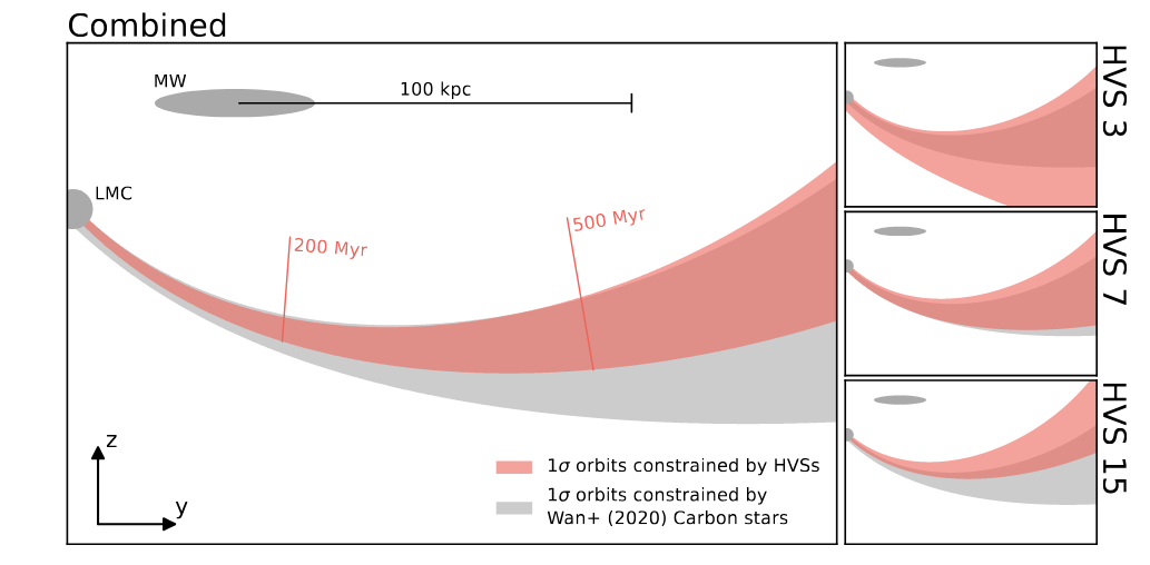 Second, a few high-velocity stars (remember them?) appear to have left the LMC a long time ago and, by chance, flown into the Milky Way. If we project their trajectories backward in time, we can find the location of the LMC over the past few hundred million years.