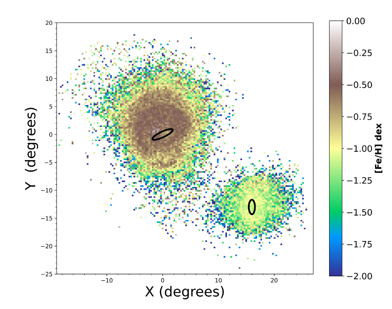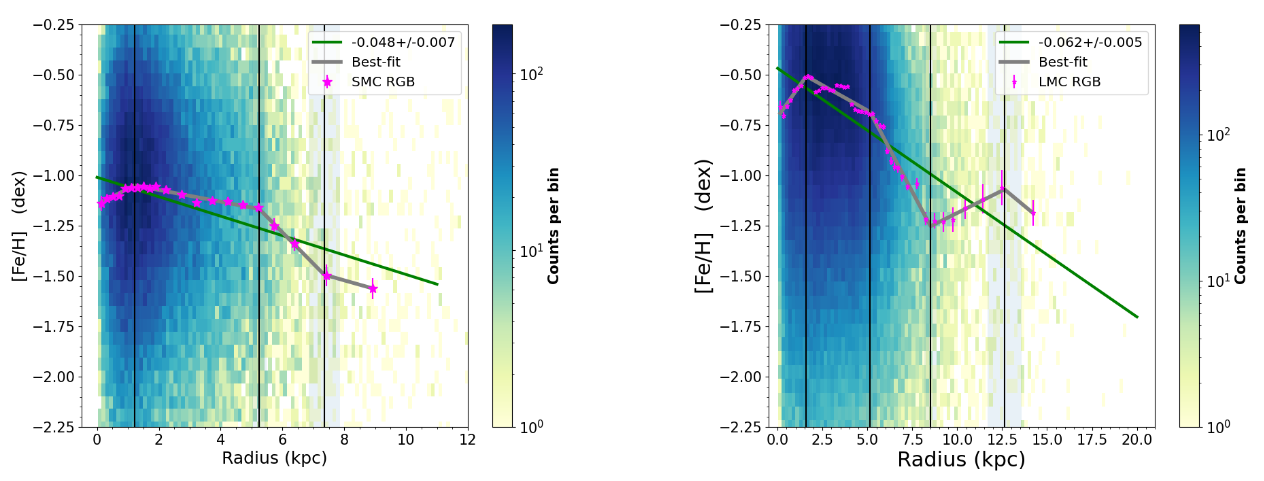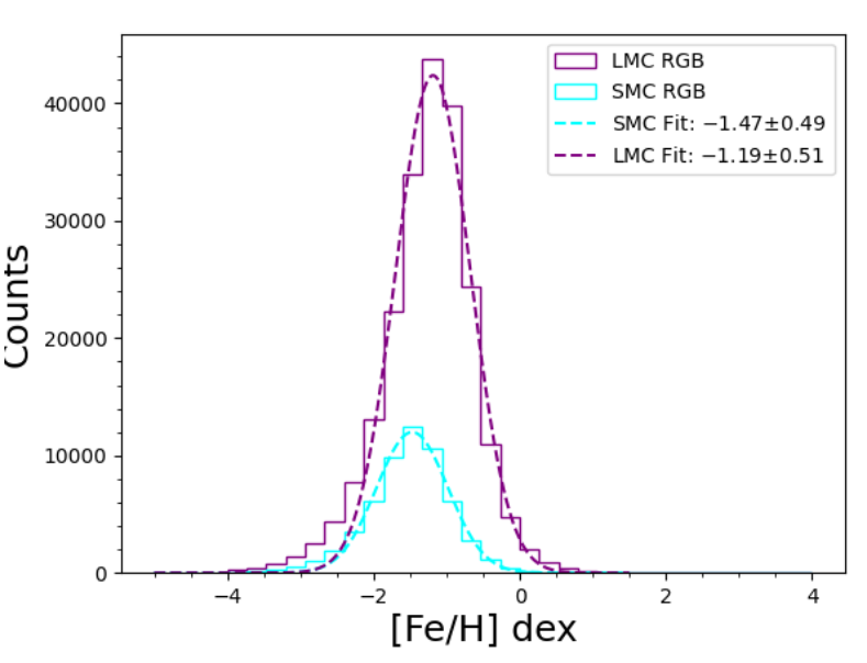 The Gaia spacecraft, despite its small size -- the aperture was only about 1 meter in diameter -- was able to acquire low-resolution spectra of many stars in each of the Clouds. Take a look at the metallicities it measured: