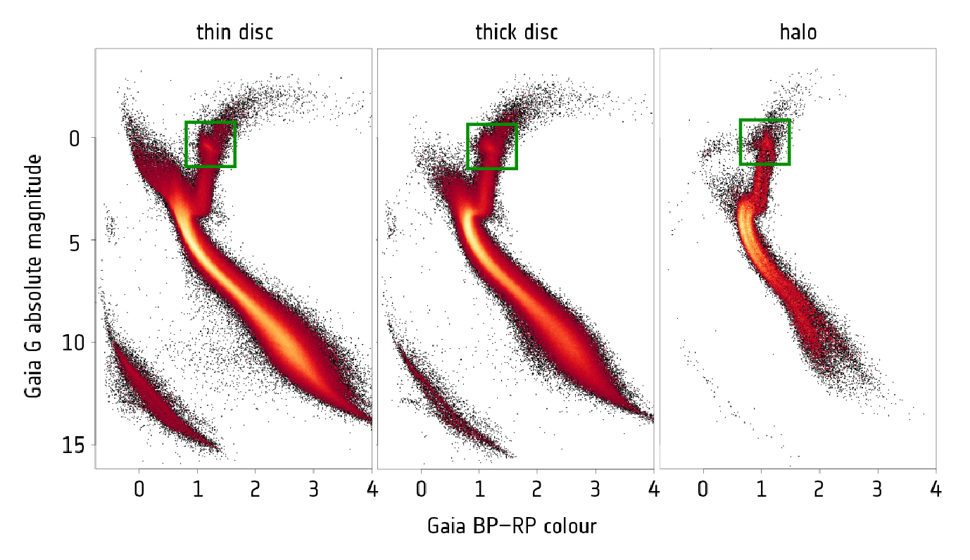 You are, I hope, familiar with the Hertzsprung-Russell diagram. The examples below use data from the Gaia satellite and were created in 2018. I've drawn a green box over a section of the red giant branch which appears to have a larger density of stars: the red clump (a very imaginative name, isn't it?)