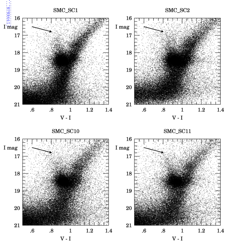 Below are figures showing a closeup of the HR diagrams for four regions of the SMC ...