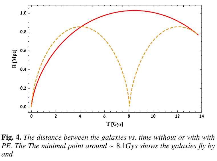 The diagram below shows two possibilities for the separation of our Galaxy and Andromeda over the age of the universe. "PE" stands for "Previous Encounter," in which the two galaxies swept past each other at some point in the past. Note that both scenarios end with the two galaxies a distance 0.76 Mpc = 760 kpc apart at the current time, just as we observe.