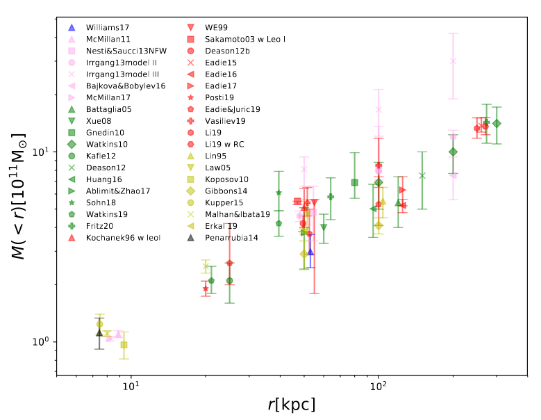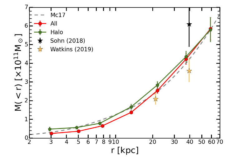 Sun et al. use their measurements of many globular clusters, together with a more sophisticated analysis of their orbital motions, to determine the mass of the Milky Way as a function of radial distance. They find it rises slowly .. how do their estimates agree with ours?
