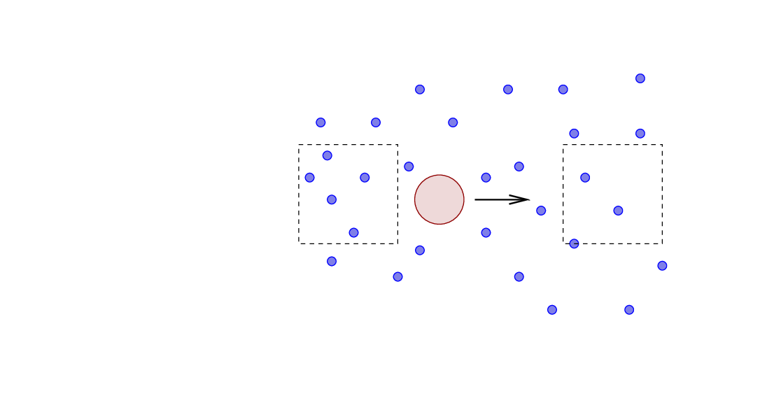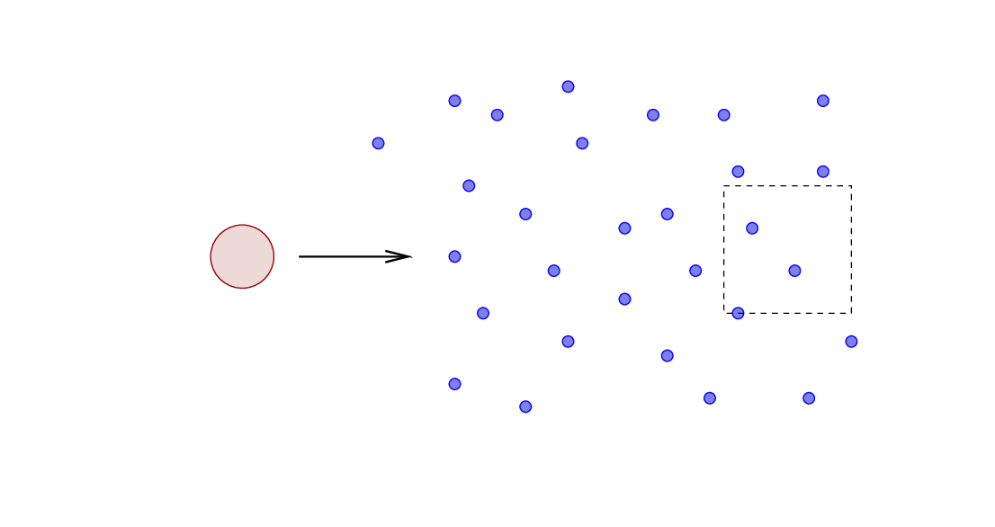 Why? Well, consider one massive object as it approaches a region of space filled with low-mass objects at some initial density n. In the picture below, that density appears to be about 2.5 stars per box.