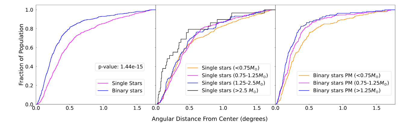 Motherway, E., et al., ApJL 962, L9 (2024) were able to measure the radial distribution of single and binary stars (left panel), and even separate binary stars into groups by mass: