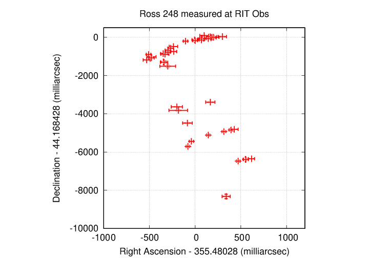 In order to get the best results for Ross 248, it is necessary to use only a subset of the stars in the camera's full field of view. For this evening's data, I chose the "intermediate" subset, and restricted matches to those stars within about 11 arcminutes of the target. It helps to limit the measurement of stars in the images to this same region, too.