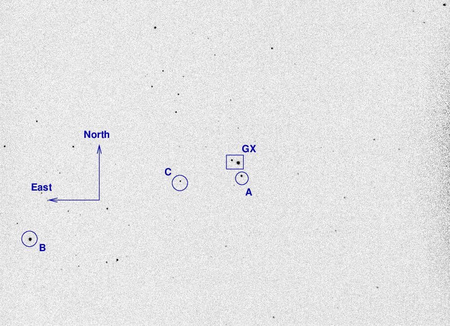 The two components of the GX And binary sit inside the box. I've marked the location of several comparison stars as well.