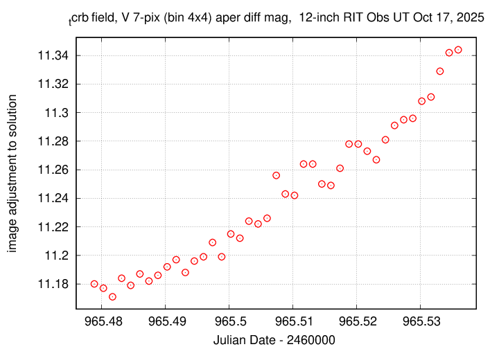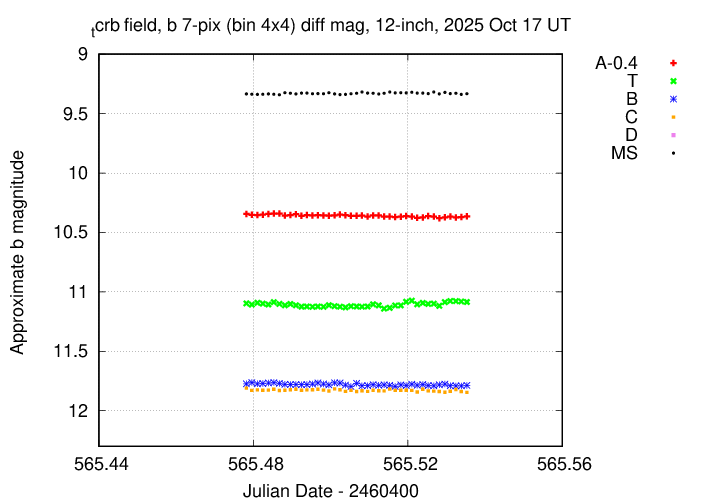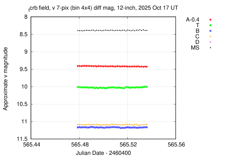 On the night of Oct 16/17, 2025, under very good conditions, I acquired images of the recurrent nova T CrB. This star undergoes outbursts at long intervals of 80 years or so. Its next outburst is predicted to occur soon (but then again, it was also predicted to occur during 2024), and so I've joined the crowd who are monitoring it.