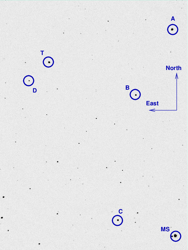 I've marked the location of several comparison stars, with magnitudes and names taken from the AAVSO's table X40237AAS. Note that the magnitudes listed for stars "A" and "B" have changed from the ones I listed in last year's notes.