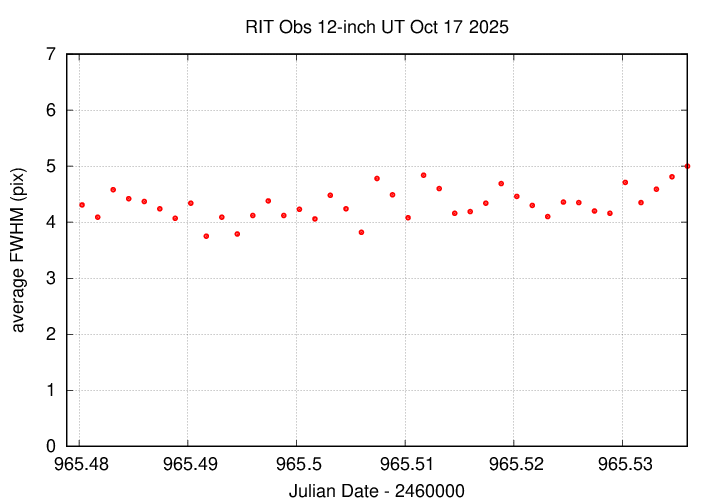 The graph below shows changes in the photometric zeropoint of an ensemble solution of the instrumental magnitudes over the course of the run. Again, no sign of clouds (or bad guiding).