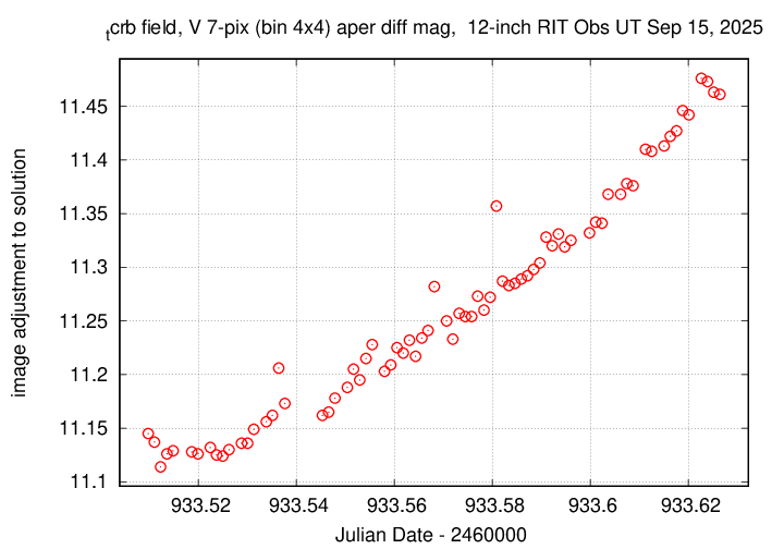 On the night of Sep 14/15, 2025, under good conditions, I acquired images of the recurrent nova T CrB. This star undergoes outbursts at long intervals of 80 years or so. Its next outburst is predicted to occur soon (but then again, it was also predicted to occur during 2024), and so I've joined the crowd who are monitoring it.