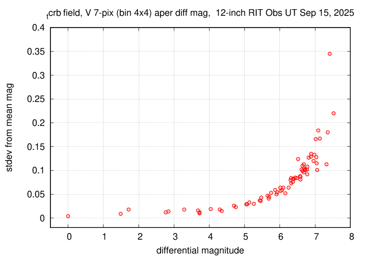 Sigma-vs-mag plots show that the floor in V-band was about 0.008 mag in V, inflated due to trailing. it was 0.009 in B.